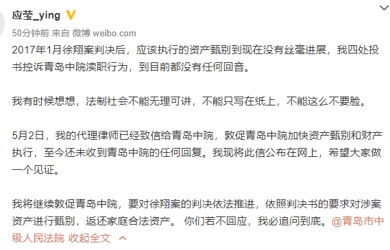 今早约10点,应莹又在微博发文,声称2017年1月徐翔案判决后,应该执行的资产甄别到现在没有丝毫进展,“我四处投书控诉青岛中院渎职行为,到目前都没有任何回音”。