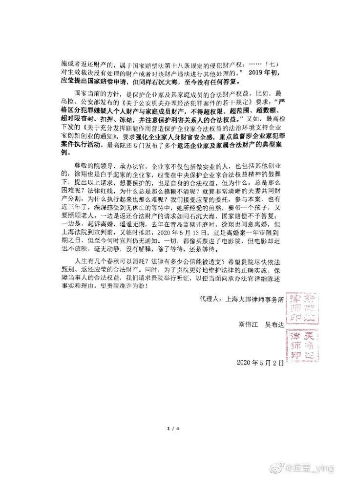 在信中,应莹代理律师表示,目前徐翔夫妻剩余合法财产约120亿,根据罪责自负原则,徐翔110亿罚金只能从其个人财产中追缴,即使不能全部追缴,也不能株连属于妻子应莹的60亿合法财产。