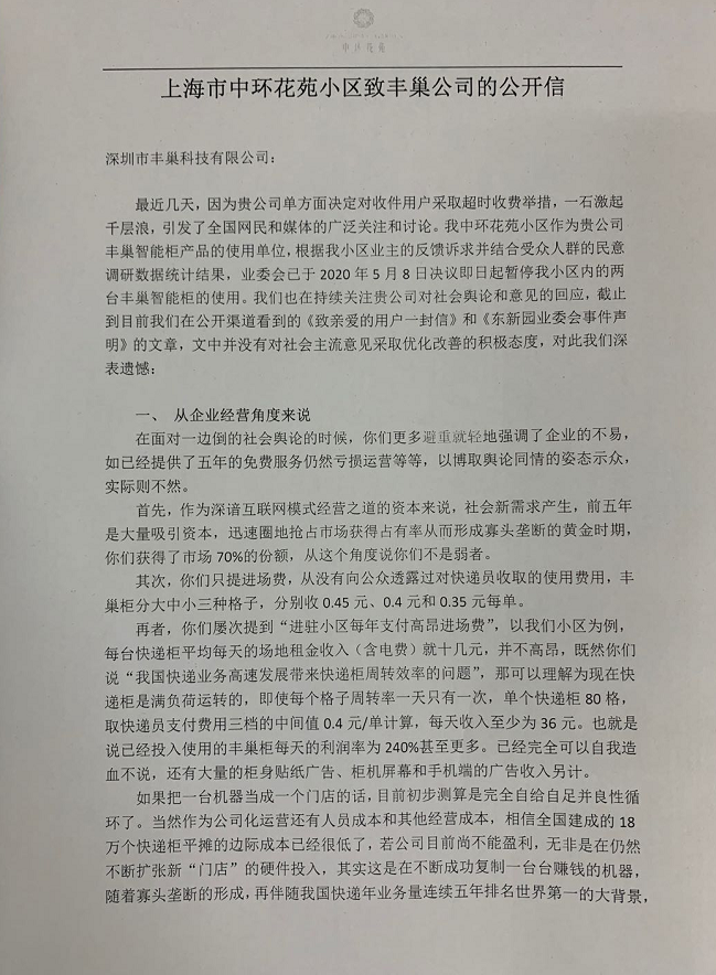 作为上海首家宣布暂停使用丰巢快递柜的小区,中环花苑小区今日发布了致丰巢公司的公开信,再次重申两大诉求:1. 在快递柜上张贴醒目提示,请快递员必须先行联系客户同意下方可投入丰巢柜;2. 免费时长延长到24小时。