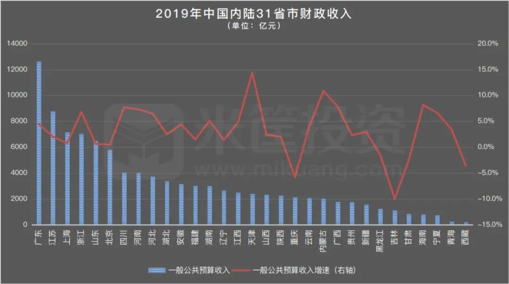 从财政收入增速来看,由于减税降费力度较大,各省的变化也很大。其中,天津以14.4%的增幅高居第一,内蒙古则以10.9%的增速位居第二,也是仅有的两个增速超过10%的省份。