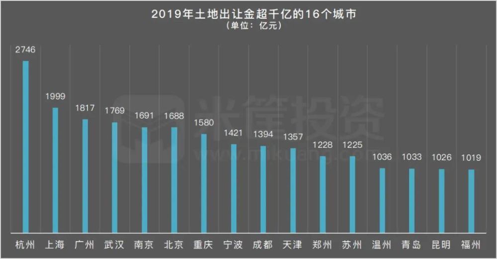 其中,有16个城市的土地出让金超过1000亿元,相比2018年新增加了6个城市。