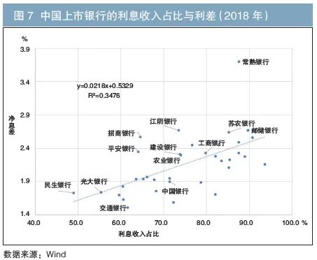 在利率市场化背景下,我国商业银行正在朝专业化方向发展。中国主要上市银行在“净息差—利息收入占比”空间坐标系中的分布,也一样呈现向右上方倾斜的线性分布(见图7)。工商银行、农业银行、中国银行及建设银行的两项指标居中,与美国主流银行相似。民生银行、光大银行等对公业务占比高,净息差相对较低。邮储银行、苏农商行[2]等银行零售业务占比高,净息差在行业中最高。其中,比较特殊的是常熟银行,这是一家以本地零售业务为主的银行,净息差在全行业遥遥领先,与美国西太平洋银行可以比肩。中国也有可以比肩美国第一资本金融公司的银行,就是尚未上市的微众银行,其2017年净息差高达7%。另外,平安银行、招商银行等正在大力推进“零售+金融科技”战略,其表现明显异于大部分银行。