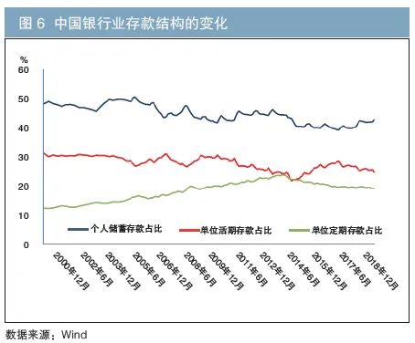我国银行业存款结构虽然没有出现明显的“储蓄化”趋势,但是定期存款占比也出现了“先升后降”的过程。这与美国20世纪80年代利率市场化进程中的经历类似,背后是金融创新的增加及存款计息方式的多元化。2014年以来,单位定期存款占比的下降,以及单位活期存款和个人储蓄存款占比的上升(见图6),在一定程度上就与越来越多的银行与支付机构、基金管理公司合作推出各种“宝”类现金管理产品有关。这类现金管理产品支取灵活且利率不低于普通定期存款。