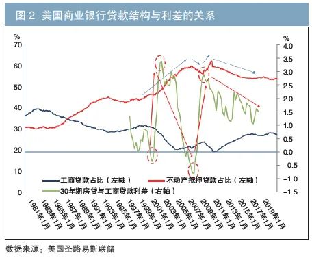 贷款作为生息资产的主要部分,其内部结构也发生了明显变化,表现出“房贷化”偏好。其中,不动产抵押贷款(主要是住房按揭贷款)的占比在震荡中上升,从1981年的30%左右上升至2006年的60%左右,然后在2008年全球金融危机中降至56%,随后又反弹到2009—2010年的最高水平62%,之后又慢慢回落到2019年的54%左右,呈现出“M”形走势。出现这一走势的原因,主要是随着房地产价格的波动,不动产贷款利率与工商贷款利率的利差呈现出明显的“M”形波动。在2008年全球金融危机之前,房地产市场日益繁荣,不动产贷款利率上升速度快于工商贷款利率上升速度;全球金融危机期间,两者利差急剧下降,之后伴随量化宽松而短暂反弹;在2010年见顶后,两者利差又震荡下行(见图2)。