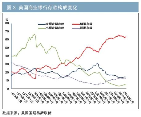 美国银行业存款结构的变化呈现明显的“储蓄化”特征。1982年以前,活期存款和储蓄存款占比呈下降趋势,定期存款占比呈上升趋势,尤其是小额定期存款占比到1982年一度上升至66.8%的高点(见图3)。然而,随着金融创新的深化,尤其是随着付息支票账户(NOW)和货币市场存款账户(MMDA)的推出,活期存款与定期存款占比快速下降,储蓄存款占比持续上升,2019年底已经达到64%。