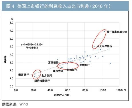 经过多年的竞合,美国商业银行已经形成三种类型:投行型、综合型和零售型(互联网型)。以银行的利息收入占比为横轴、净息差(存贷利差)为纵轴绘制坐标(即“净息差—利息收入占比”空间坐标系),美国主要的上市银行大致沿着向右上方倾斜的趋势线性分布,利息收入占比越高的银行,其净息差越高(见图4)。其中,以道富银行、纽约梅隆银行和北方信托为代表的投行型银行,净息差最低,利息收入占比也最低;以摩根大通、美国银行、花旗银行和富国银行为代表的综合型银行,净息差和利息收入占比都居中。以第一资本金融公司和西太平洋银行为代表的本地零售型(互联网型)银行,净息差和利息收入占比最高。