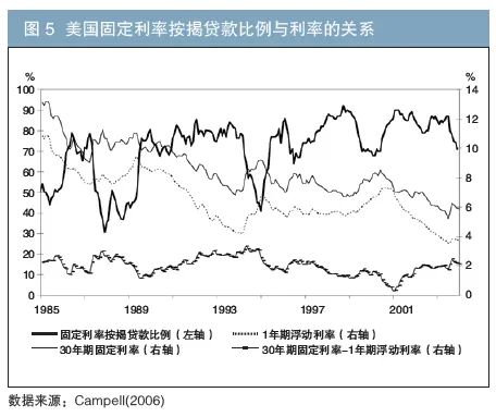 Campell(2006)的研究展示了1985—2002年美国固定利率按揭贷款(FRM)和浮动利率按揭贷款(ARM)的比例情况。在1985年、1987年、1995年和2000年,当30年期固定利率较高且与1年期浮动利率的利差较高时,固定利率按揭贷款比例较低。在其他绝大多数时候,固定利率按揭贷款比例都为70%以上(见图5)。这体现了一种“适应性预期”,即人们认为当前的利率水平会长期持续下去,因此往往根据当下的利率做决定,而不是基于整个还款期间的利率水平来决策。美国民众偏爱固定利率贷款,也与按揭再融资非常便利有关系。本文研究发现,95%选择再融资的借款人都能在4年内达到降低按揭利率的效果,因此如果美国民众发现之前的固定利率贷款定价偏高,他们中很多人会选择再融资来降低利率。