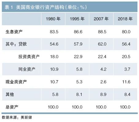 在1980年利率市场化启动初期,美国银行业生息资产的比重为83.8%,2007年上升到88.5%,但随着2008年全球金融危机后美国银行业对资本充足率和流动性比率要求的提高,2018年生息资产的比重又下降到80%左右。在生息资产中,贷款和投资类资产的比例也呈现倒“V”形变化,但是同业资产的比例一直呈下降趋势。相应地,现金类资产的比例则呈现“V”形走势,到2008年全球金融危机之前降至2.6%的水平,但危机后又持续上升,2018年已经达到11.6%的水平(见表1)。