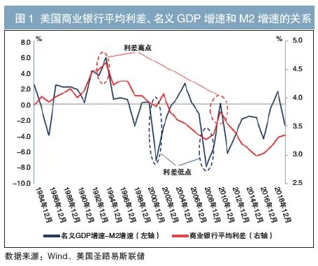 利率市场化并不必然意味着利差下行,利差主要受资金供求影响。虽然20世纪80年代至今,美国银行业的利差总体上是趋于下降的,但是这并不完全是利率市场化的结果。在1986年利率基本市场化之后,美国商业银行的平均利差先升后降,到1994年达到4.62%的高点,随后逐步下行至2015年2.98%的低点,之后有所反弹。美国银行业利差变化的主要驱动因素是经济增长带来的资金需求,以及货币总量增长带来的资金供给。当“名义国内生产总值(GDP)增速-广义货币供应量(M2)增速”的差值较高时,资金供不应求,利差就相对较高,如1994年和2010年(见图1);反之,利差相对较低,如2001年和2008年。因此,几十年来美国银行业利差趋于下降,主要是经济增长变缓、货币发行量增多的结果。即随着经济总量的上升,经济增速趋于下降,此外在2001年互联网泡沫破裂和2008年全球金融危机之后,货币发行速度受外生冲击而呈阶梯式上升态势,二者均有压低利差的作用。