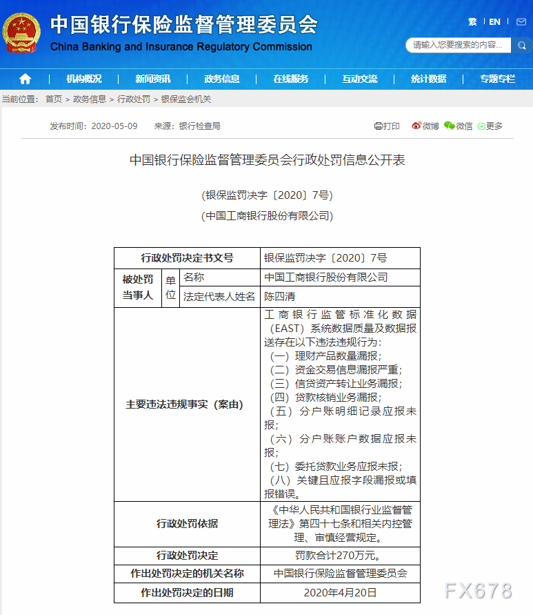 ①保险监督管理委员会行政处罚信息公开表显示,中国工商银行股份有限公司因存在理财产品数量漏报;资金交易信息漏报严重;信贷资产转让业务漏报;贷款核销业务漏报;分户账明细记录应报未报;分户账账户数据应报未报;委托贷款业务应报未报;关键且应报字段漏报或填报错误的行为,被罚款合计270万元;