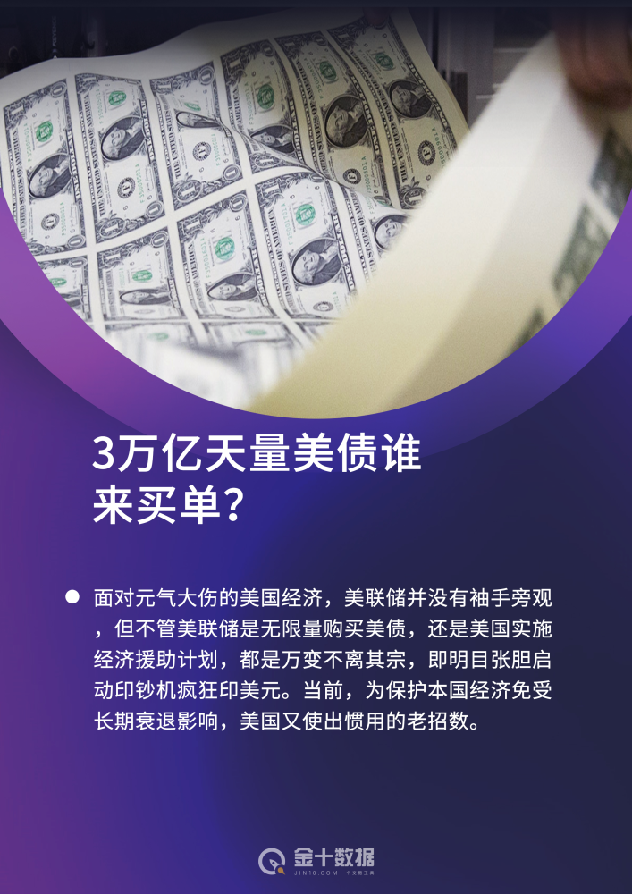 事实上,面对元气大伤的美国经济,美联储并没有袖手旁观,不仅接连降息至零,更是放出无限QE大招,还凭一己之力为美国推出的多项救市计划融资,累计撒钱近3万亿美元。需要注意的是,不管美联储是无限量购买美债,还是美国实施经济援助计划,都是万变不离其宗,即明目张胆启动印钞机疯狂印美元。