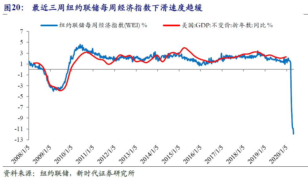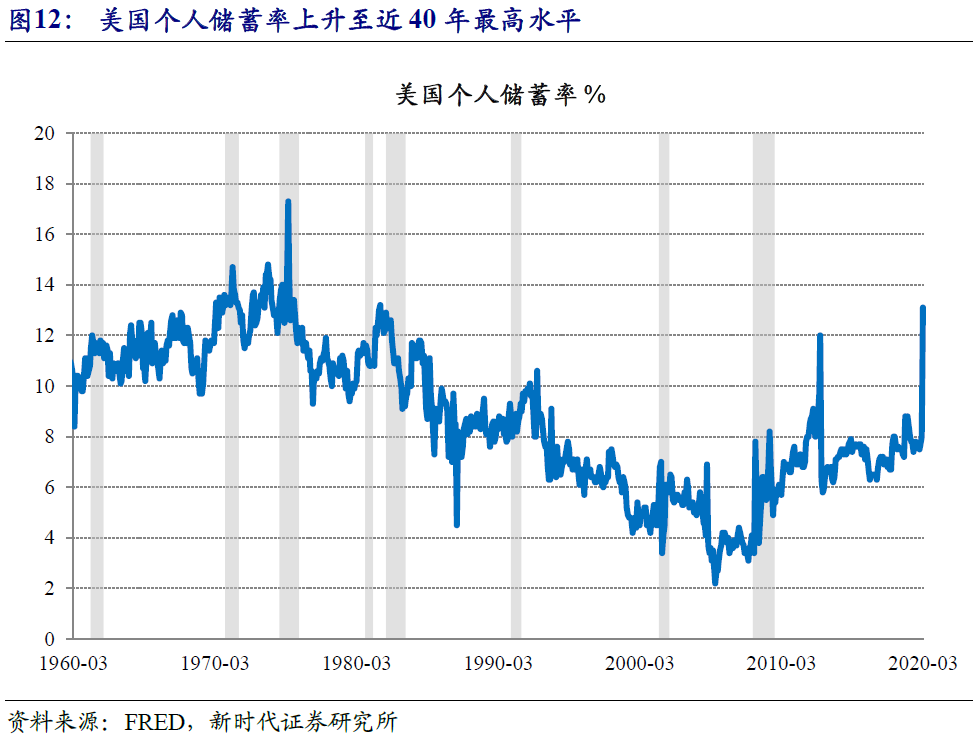 (3)美国居民预防性储蓄可能增加,制约消费修复。不管是地震、洪水这样的自然灾难,还是瘟疫这样的公共卫生事件,都会导致未来收入和支出的剧烈波动,为了自己及家人有更多的资源应对这种不确定性,人们会削减消费,增加预防性储蓄。1918-1920年爆发的“西班牙流感”提高了美国居民的预防性储蓄;即使像次贷危机这样的非自然灾害,也对美国储蓄率产生了深远影响。次贷危机后,美国居民的生活方式发生了改变,他们更加节俭,储蓄率开始有所回升,贸易逆差占GDP比重也在下滑。目前来看,美国个人储蓄率从2019年末的7.5%上升至2020年3月末的13.1%,为近40年最高水平,当然这一定程度可能与隔离措施有关,不过从中国居民预期来看,未来更多储蓄占比从2019Q4的45.7%上升至2020Q1的53%,显示疫情之后居民增加储蓄的意愿比较强,由于美国疫情仍然存在不确定性,因此美国居民增加预防性储蓄的意愿可能也会比较强,这会制约消费修复速度,而美国经济主要靠消费拉动。