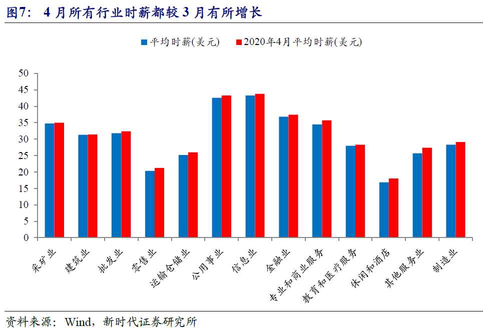 4月时薪增速属于异常值,反映低薪行业与低薪从业者受疫情冲击最大。4月时薪环比与同比分别增长4.7%、7.9%,均为金融危机时期以来最高,也均显著高于前值的0.5%、3.3%。4月如此高的时薪增速属于异常值,主要有两点原因:(1)疫情影响之下,各行业低薪员工最先离开工作岗位,4月所有行业平均时薪都较3月有所增长,大部分行业时薪增速较3月提升;(2)低薪行业就业损失相对较大,以休闲和酒店业为例,4月该行业新增非农就业人数为-765.3万人,4月失业率从8.1%飙升至39.3%,4月时薪只有18美元(全行业最低)。由于时薪只统计在职人员,上述两个因素显著拉升了时薪增速,因此4月时薪增速与历史数据没有可比性,这与2017-2019年中国规模以上工业企业利润累计值同比和累计同比存在巨大缺口有一定相似性。