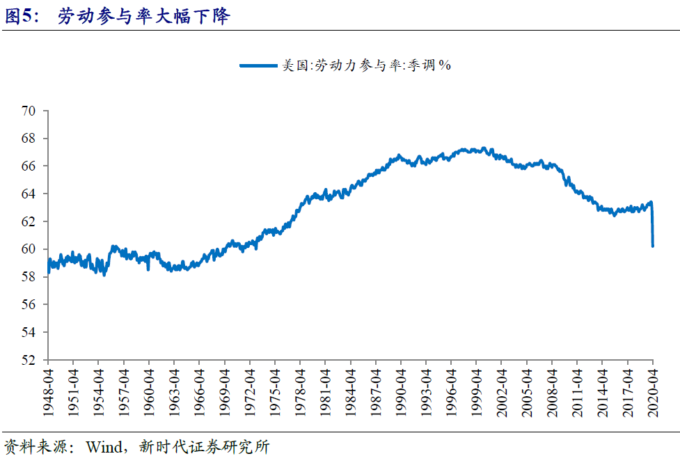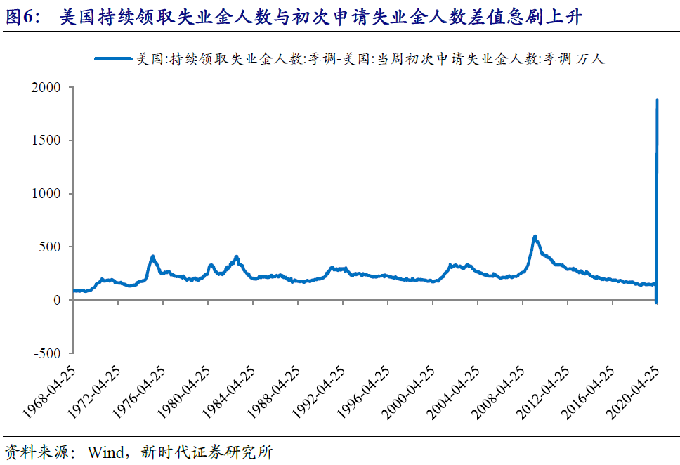 失业率低于市场预期主要原因是劳动参与率快速下降。美国4月失业率从4.4%上升至14.7%,市场预期16%。虽然4月失业率没有突破历史新高,但从上升速度来看,远远超出美国历次衰退期间,也足以看出本次疫情对经济杀伤力之大。4月失业率飙升在市场预期之内,因此数据公布后资产价格没有太大反应,同时,14.7%的失业率还低于市场预期,和初次申请失业金人数所隐含18%左右的失业率也有较大差距,这主要是因为劳动参与率大幅下降2.5个百分点至60.2%,单月下降幅度创历史新高,也就是有相当一部分人已经选择退出劳动力市场而没有纳入失业率统计范畴,从而导致失业率较市场预期以及初次申请失业金人数隐含的失业率偏低,但同时也反映出美国居民对就业市场极度悲观。美国劳工部在报告中指出,如果将4月“受雇佣但由于其他原因而缺勤”的人数中高于往年4月一般水平的部分归入“失业人数:暂时性失业”项中,未季调失业率将会比报告值上升5个百分点。美联储卡什卡里认为“糟糕的非农就业报告低估疫情损害,因为有很多人没有寻找工作,实际失业率可能在22%-24%之间”。同时,4月以来,持续领取失业金人数与初次申请失业金人数差值在急剧上升,截至4月25日当周,两者差值达到1880.1万人,这也侧面反映短期就业压力之大。