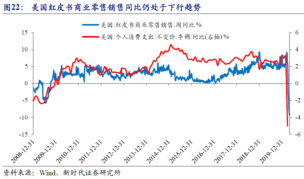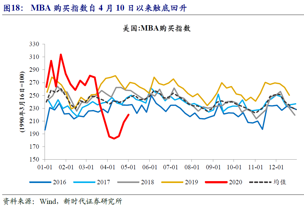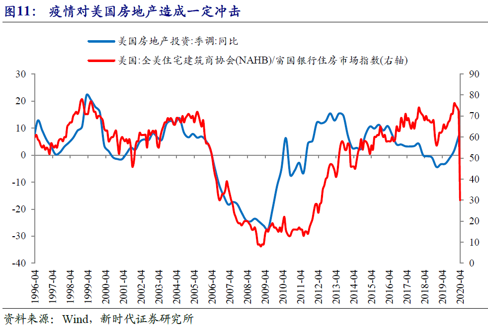 (4)利率大概率仍保持低位,有利于美国房地产投资增长。美国一季度经济数据有一个细节是,虽然经济步入衰退,但房地产投资环比折年率达到了21%,为2013年以来最高,说明在封城之前,美国房地产景气度比较高。封城之后,房地产市场也受到一定程度影响,4月美国住宅建筑商协会(NAHB)住房市场指数从72下滑至30,在复工之后,利率大概率会维持在低位,近期联邦基金期货曲线甚至开始定价负利率,利率低位将有利于美国房地产投资快速修复。