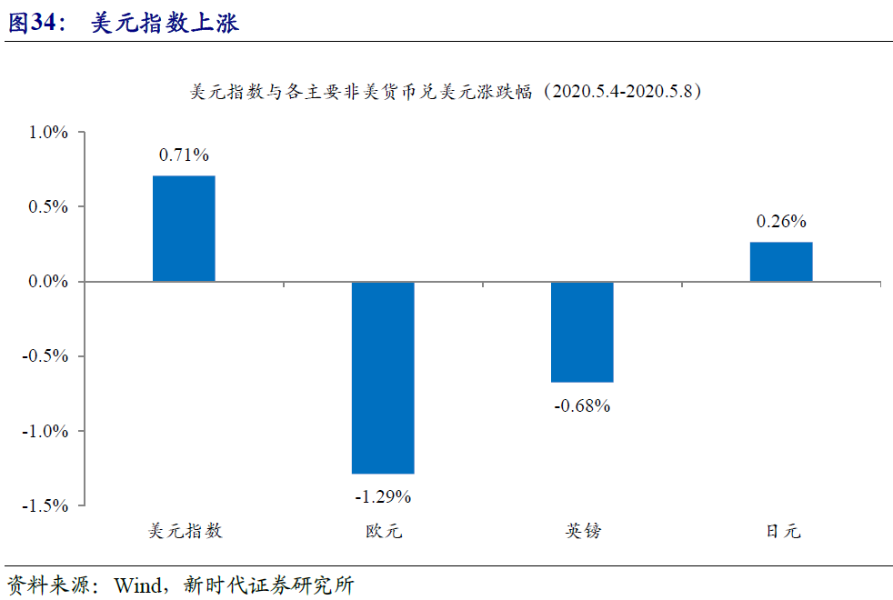 美元指数上涨,人民币贬值。上周,美元指数上涨0.7%至99.75,非美货币方面,英镑、欧元兑美元分别贬值0.7%、1.3%,日元兑美元升值0.2%。受五一假期特朗普声称要加征报复中国的影响,人民币汇率节后先贬后升,人民币兑美元即期汇率较节前贬值0.39%。