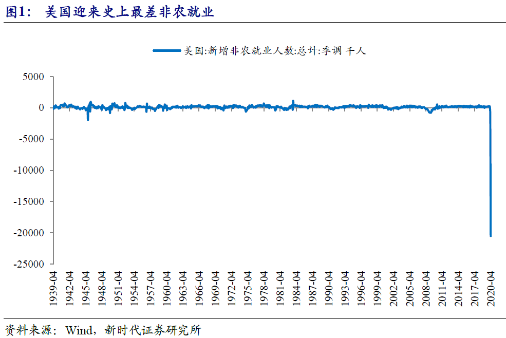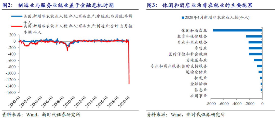 美国迎来史上最差非农就业,制造业和服务业就业受冲击均超过金融危机时期。美国2020年4月非农就业减少2050万人,为历史上最差非农就业,远差于前值(-87万人)与金融危机时期。分行业来看,4月服务业、建筑业、制造业非农就业分别减少1716万人、97.5万人、133万人,服务业中的休闲和酒店业新增非农就业减少765.3万人,为主要拖累。分行业对比2020年4月与金融危机时期非农就业数据,制造业就业在2020年4月已经明显脱离此前的波动区间,不过收缩程度仍然不及服务业,这与4月美国服务业PMI差于制造业PMI反映的信息相一致。