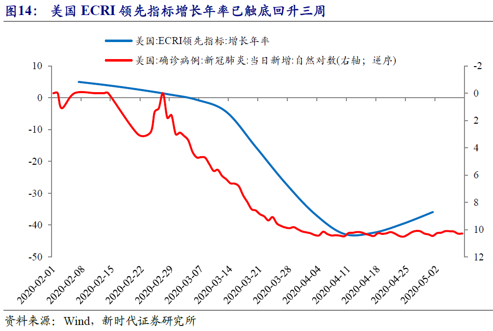 未来一段时间重要的是美国经济“填坑”速度而非失业率。就业本质是滞后指标,3-4月失业率数据没有及时反映美国经济衰退的程度,未来一段时间美国失业率可能仍处于高位,同样不能反映美国经济从衰退逐渐修复的过程。同时,我们关注的不是年度经济增速均值会如何,在美国经济一季度负增长、二季度大概率负增长的情况下,指望全年经济增速能回到过去的水平已经不太现实,我们更应该关注经济的边际变化,也就是在美国复工之后,最差的时刻大概率已经过去了,近期美国ECRI领先指标、交通出行强度、谷歌社交活动指标、活动趋势指数有触底回升迹象,预示着美国经济“填坑时刻”降至。