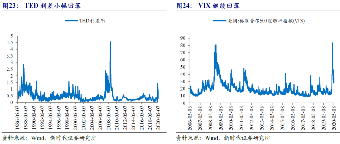 上周美国金融市场流动性压力与恐慌情绪继续缓解,Ted利差进一步回落0.1个百分点,VIX继续回落至27.98。美国信用风险也有所缓解,高收益企业债利差从7.7%回落至7.6%。