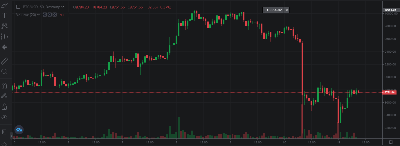 据虚拟货币交易所Bitstamp显示,北京时间5月10日早上8点开始,比特币单价在半小时内从9500美元价位瞬间下跌了上千美元,最低价格跌破8200美元,最高价差超1400美元。5月11日凌晨开始有小幅反弹,最新报价为8752美元。