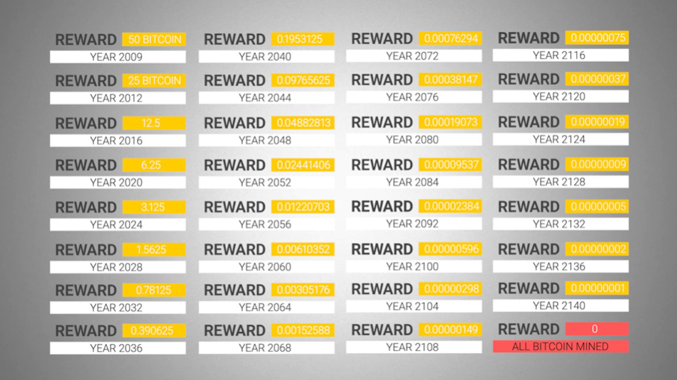 奖励从2009年初始的50比特币每隔4年减少为25、12.5,今年将变为6.25 BTC/块,并继续下降……预计最后一聪会在2140年挖完。一旦2140年过去,矿工将仅从BTC交易费中获得收入。