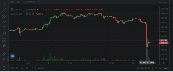 据虚拟货币交易所Bitstamp.net显示,北京时间5月10日早上8点开始,比特币单价在半小时内从9500美元价位瞬间下跌了上千美元,最低价格跌破8200美元,最高价差超1400美元。24小时全网爆仓6.44亿美元。