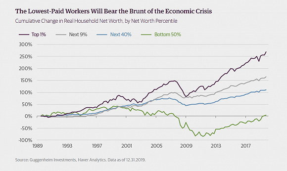 Minerd强调,本次危机对家庭的损害将影响人们未来十年内的生活水平。与此同时,大规模裁员正使这个问题变得更为复杂。从事低收入服务业工作的年轻时薪工人首当其冲地承受着经济痛苦,而这些人是最不能够出现收入中断的人群,随着消费的急剧下降,这将加剧企业裁员带来的经济痛苦。此外,企业现金流的中断将是普遍的,而反弹将是不均衡的。随着本来已经过度杠杆化的企业部门仍被鼓励积累更多债务,信贷方面几乎不会有什么积极的结果。这些失败将阻碍最终的复苏,使其更加不平衡。