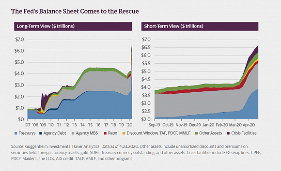 报告指出,美联储开创了一个新的市场先例。它将永远无法回到4月9日前被视为正常的水平。美联储的资产负债表在短短一个月内从4.5万亿美元扩大到了6.6万亿美元,而且很可能很快就会超过9万亿美元(如下图所示)。而且美联储并不是唯一这样做的机构。正如美国资产管理公司Evercore ISI主席埃德•海曼(Ed Hyman)所指出的,七国集团(G7)各国央行今年3月总共购买了1.4万亿美元的金融资产,换算成年率达17万亿美元,这种增速几乎是2009年4月创下的月度纪录的五倍。