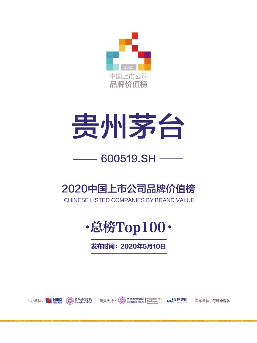 5月10日,中国品牌日,2020中国上市公司品牌价值榜发布会正式举行。当天,贵州茅台(600519,SH)上榜“2020中国上市公司品牌价值榜”总榜TOP100,排名第6位,品牌价值3449亿元,同比增加22.4%。