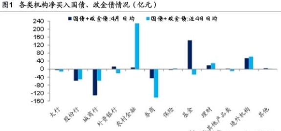 首先,根据最新的4月份中债登托管数据,银行理财、证券公司、保险和柜台减持中债登债券,而商业银行、基金、境外机构增持中债登债券。