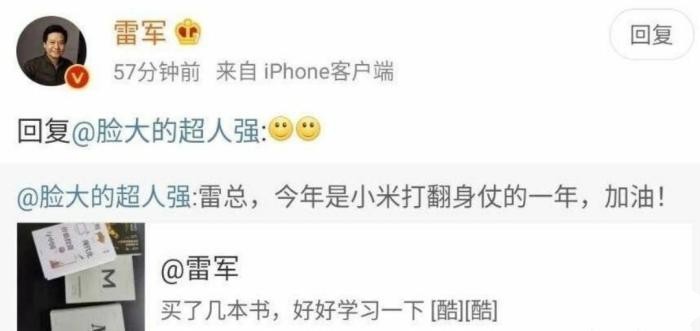 有网友发文表示,今年是小米打翻身仗的一年,加油!雷军则转发回复了几个笑脸表示感谢。然而这条回复的小尾巴赫然显示着来自“iPhone客户端”,虽然没有明示是哪款iPhone,这就说明雷军有可能主动隐藏了。按理说雷军私下使用iPhone是没什么不可以的。