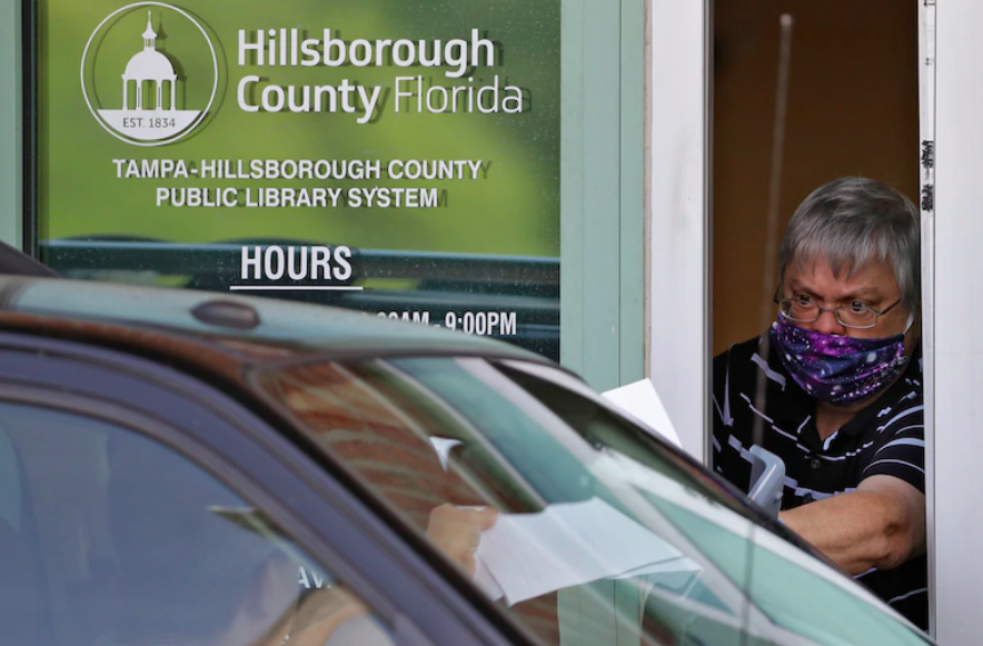 佛罗里达州一家图书馆,工作人员在派送纸质失业救济申请表 图片来源:美联社