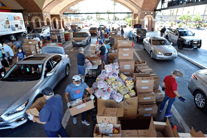 4月底的拉斯维加斯,等待领取免费食物的人们驾车在“食物银行”(免费提供食物的慈善机构)前排队