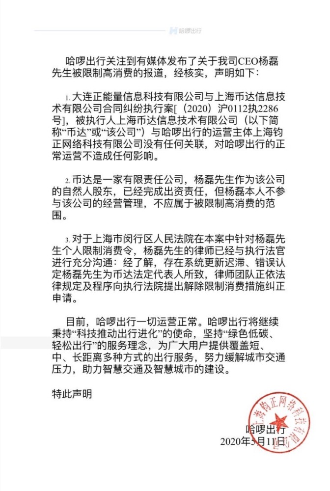 哈出行表示,上海币达信息技术有限公司是一家有限责任公司,杨磊先生作为该公司的自然人股东,已经完成出资责任,但杨磊本人不参与该公司的经营管理,不应属于被限制高消费的范围。