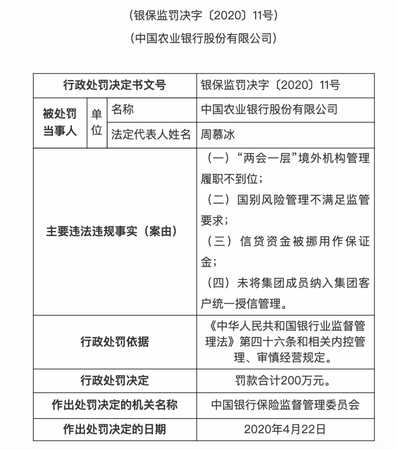 行政处罚信息公开表显示,农行此次被罚的主要违法违规事实有十项,具体包括:(一)“两会一层”境外机构管理履职不到位;(二)国别风险管理不满足监管要求;(三)信贷资金被挪用作保证金;(四)未将集团成员纳入集团客户统一授信管理。