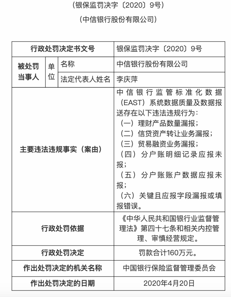 同时,中信银行也在监管标准化数据(EAST)系统数据质量及数据报送存在以下违法违规行为:(一)理财产品数量漏报;(二)信贷资产转让业务漏报;(三)贸易融资业务漏报;(四)分户账明细记录应报未报;(五)分户账账户数据应报未报;(六)关键且应报字段漏报或填报错误,其被罚没160万元。