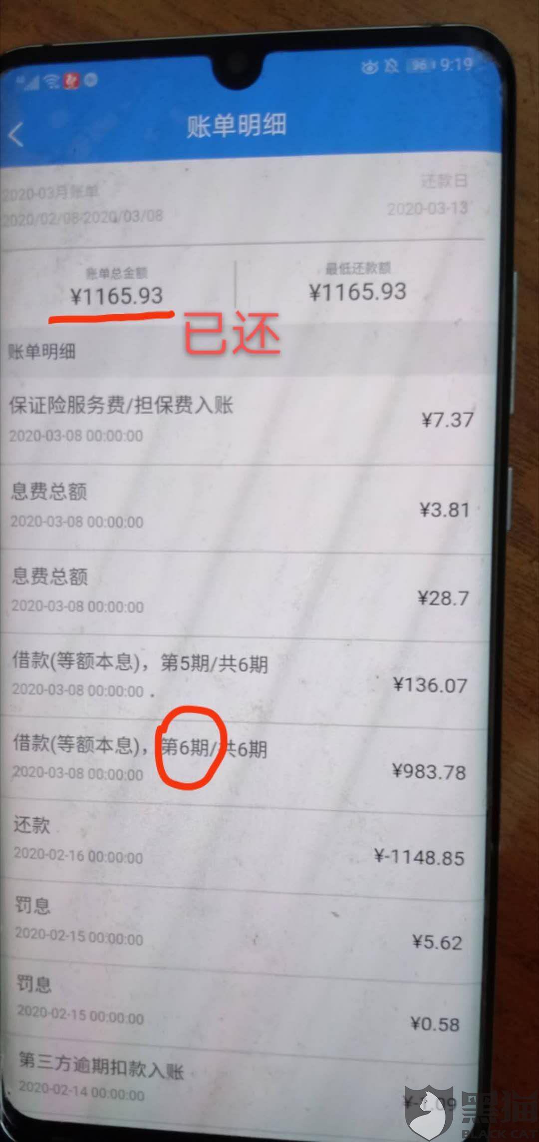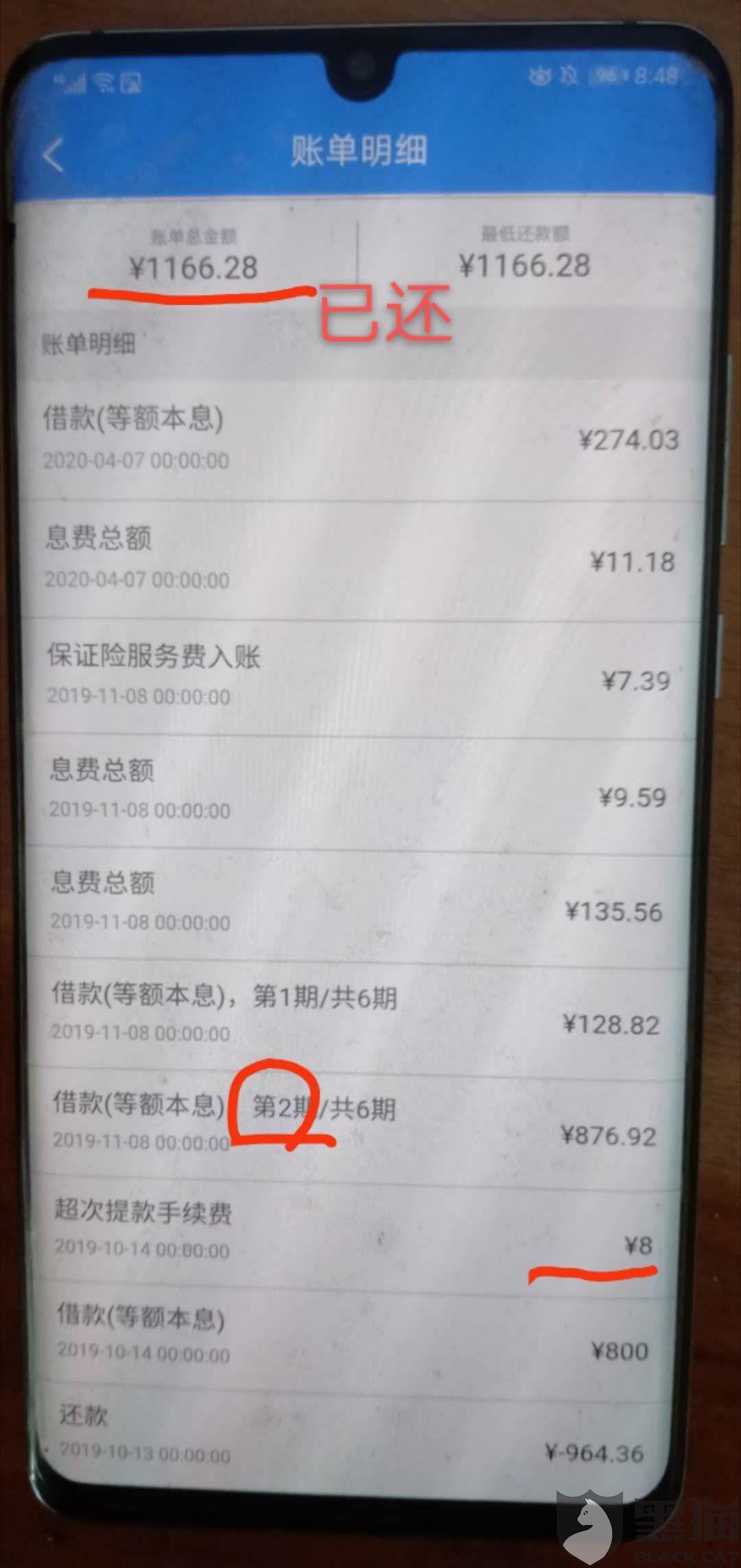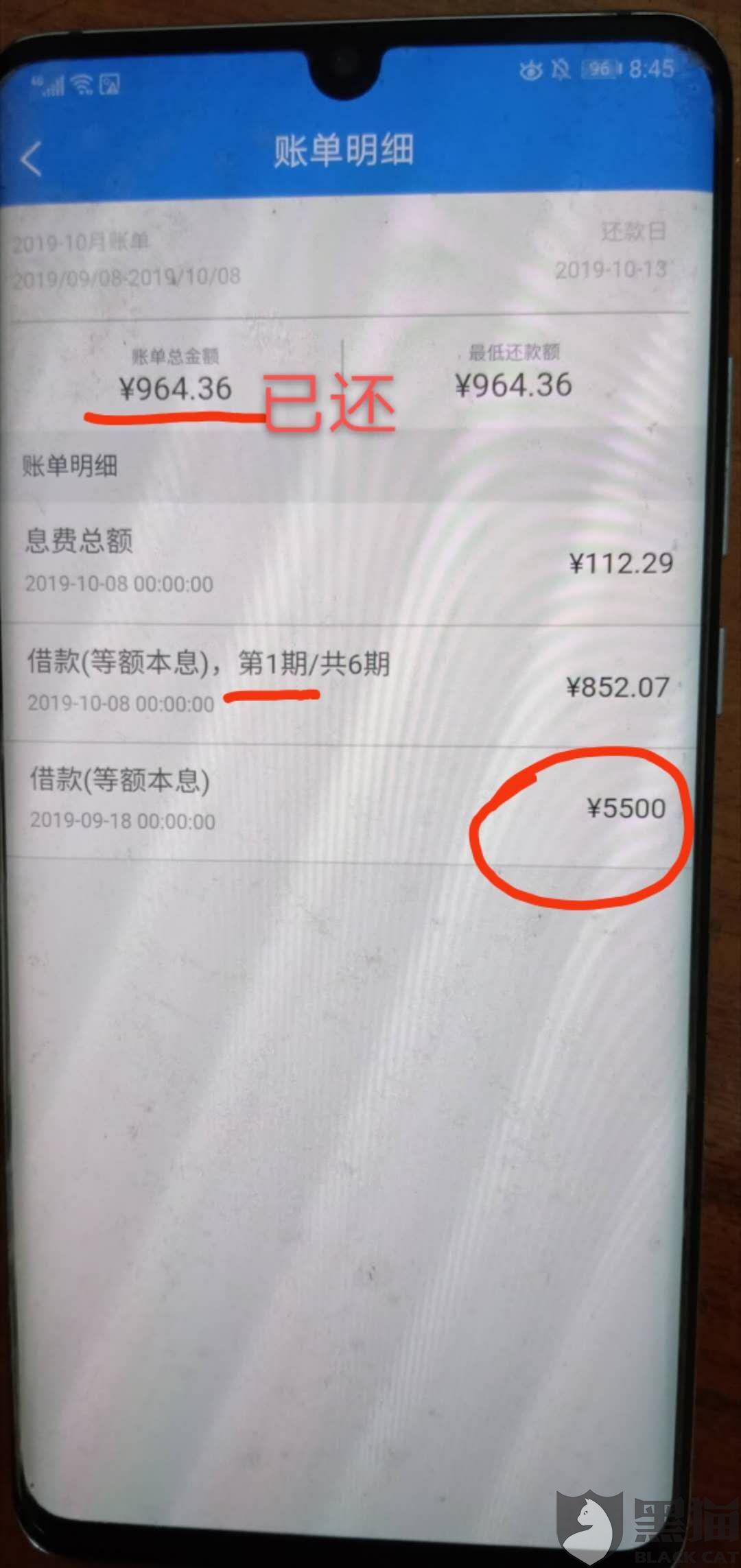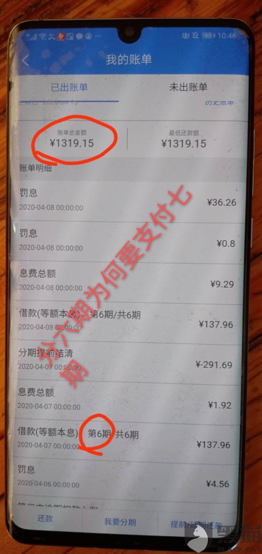 消费者“匿名”在5月5日向黑猫投诉平台反映:“上传图片为证,(因App禁止不能截图,只能影相)为什么借5500,分六期还款,出现还款双重六期,其次不明不白还在私自在本人银行卡扣划利息,要求给个合理解释,退还已还的多余金额,终止双重第六期的还款与罚息!”