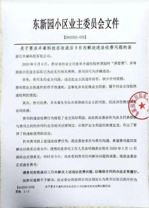 5月12日零时,杭州东新园小区业委会向浙江丰巢科技有限公司(以下简称丰巢)公开电子邮箱发送《关于要求丰巢科技在收函后3日内解决违法收费问题的函》。