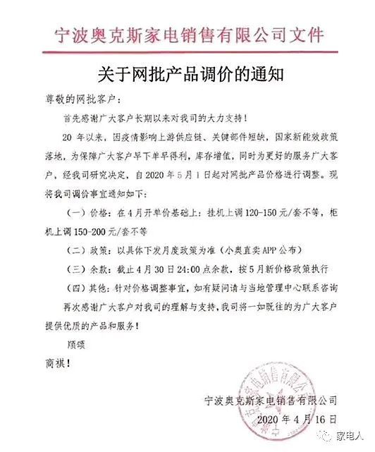 我们先看第一份涨价通知:2020年4月16日,奥克斯家电销售公司发文针对网批产品要涨价,挂机上涨120-150元/套,柜机上调150-200元。