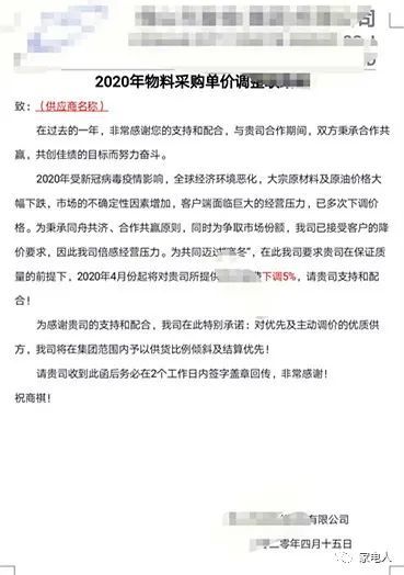 奥克斯空调想涨价,有网友在“家电人”群发信息说,美的给物料公司发函要降价。该物料采购单价调整函中说,受疫情影响,客户端面临巨大的经营压力,已多次调价,公司为了争取市场份额,已接受客户降价的要求。为共同迈过“寒冬”,2020年4月份起将对贵公司所提供的物料价格下调5%。