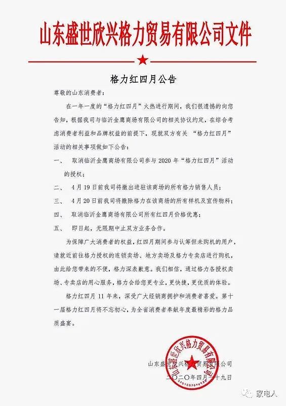 老二、老三在行动,老大格力也没有闲着。“家电人”昨天收到一位圈内人发来的“格力红四月公告”,内容是山东格力与临沂金鹰商场中止合作的事。公告说,在综合考虑消费者利益和品牌权益的前提下,取消临沂金鹰商场参与2020年“格力红四月”活动的授权,并将撤出格力商场样机和销售人员。