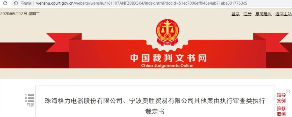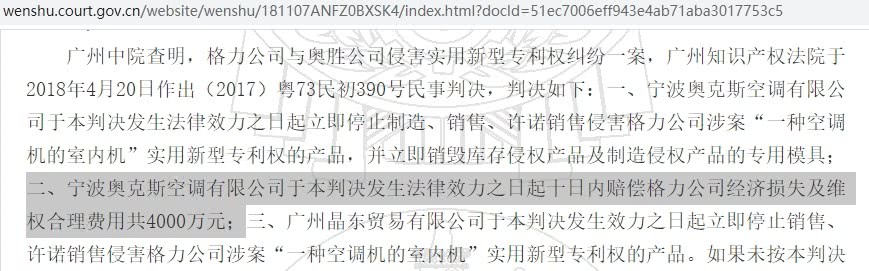记者5月12日从中国裁判文书网获悉,广东省高级人民法院做出执行裁定,终审裁定宁波奥胜贸易有限公司(原宁波奥克斯空调有限公司)恶意侵权成立,判决后者向珠海格力电器股份有限公司赔偿4000万元。