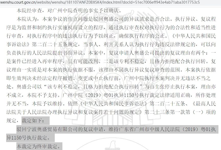 依照有关规定,广东省高级人民法院裁定驳回宁波奥盛贸易有限公司的复议申请,维持广东省广州市中级人民法院(2019)粤01执异1150号执行裁定。同时,本裁定为终审裁定。