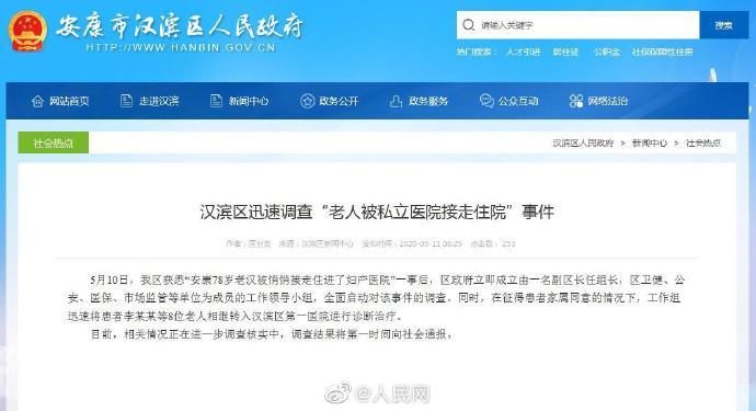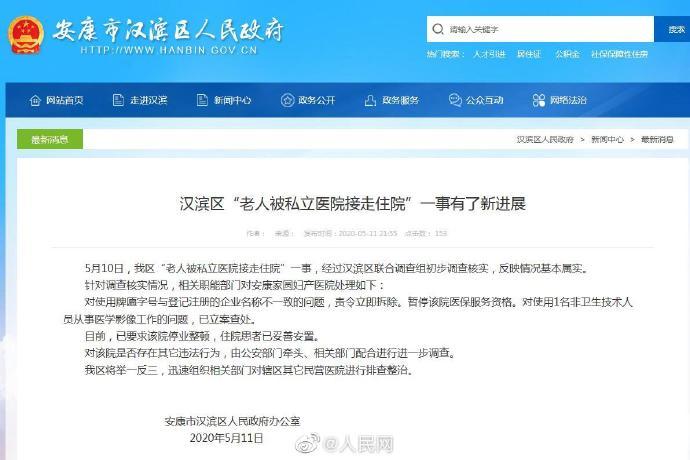 近日,就陕西安康78岁老汉被妇产医院接去住院一事,据安康市汉滨区政府消息,经过汉滨区联合调查组初步调查核实,反映情况基本属实。目前,已要求该院停业整顿,住院患者已妥善安置。此外,对使用牌匾字号与登记注册的企业名称不一致的问题,责令该院立即拆除,并暂停该院医保服务资格。(人民网陕西频道)
