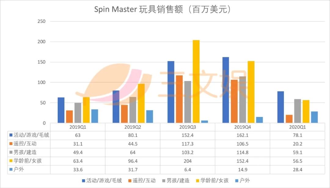 Spin Master虽然不像孩之宝那样已经有了成熟的影视制作和发行能力,但在非玩具业务方面也有深厚的积淀,展现出来了较强的抗风险能力,一季度营收只下滑了4%。