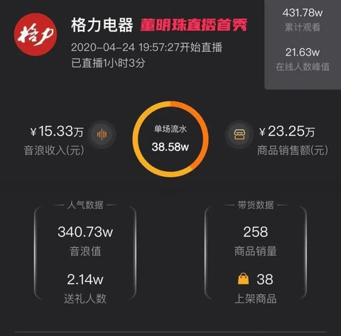 作为对照,此前的采访中,董小姐曾经透露过自有平台“董明珠的店”2019年全年销售额约为3.5亿。换句话说,仅仅三个小时的时间,董小姐就完成了传统电商一年的业绩目标。