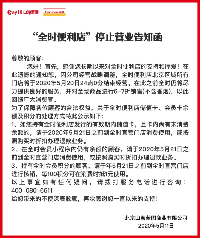 5月11日,北京全时便利店的母公司北京山海蓝图商业有限公司发布《停止营业告知函》称: