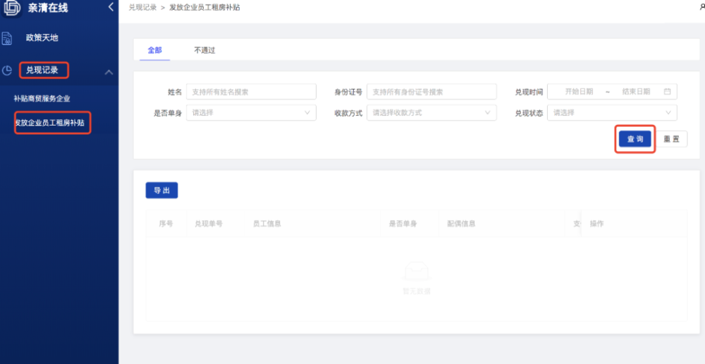 2. 选择子选项“发放企业员工租房补贴”,查询所有申请员工信息。