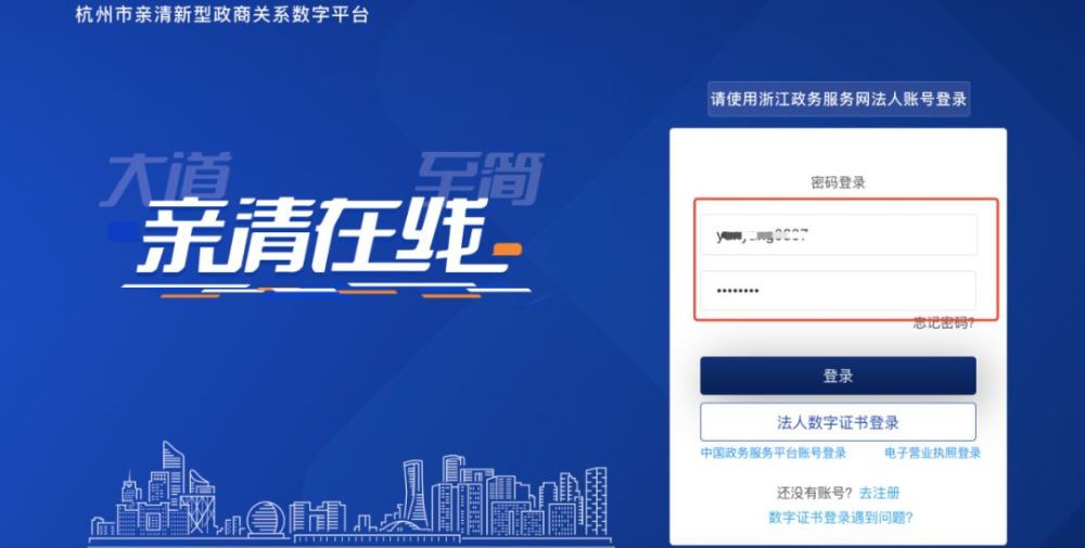 ---跳转到如下页面,请输入浙江政府服务网站的企业(法人)账号密码,并点击“登录”,如下图所示: