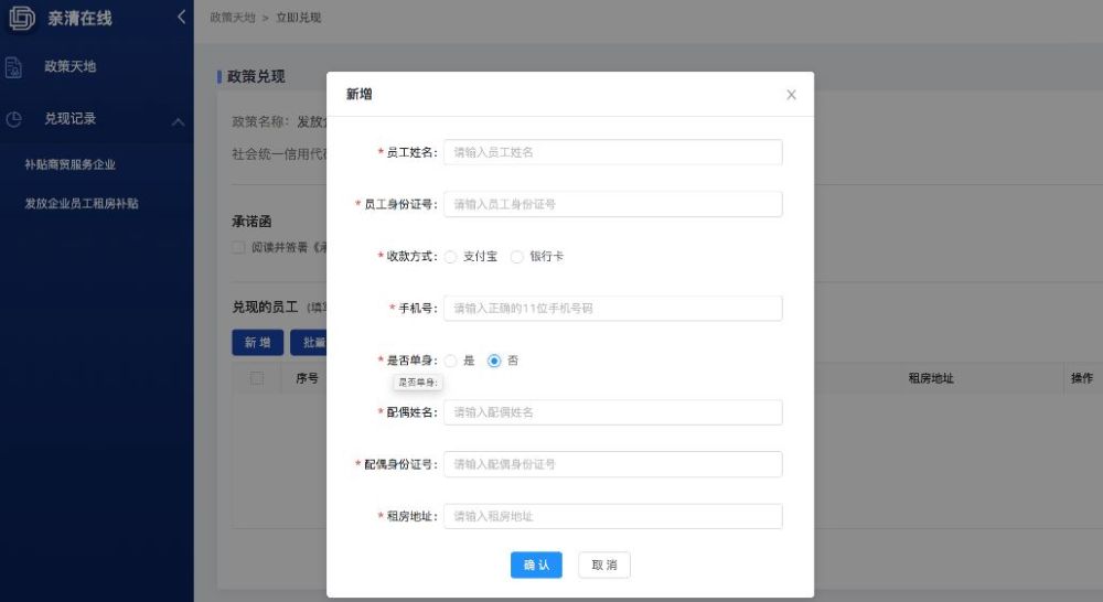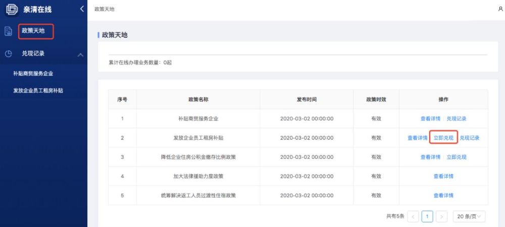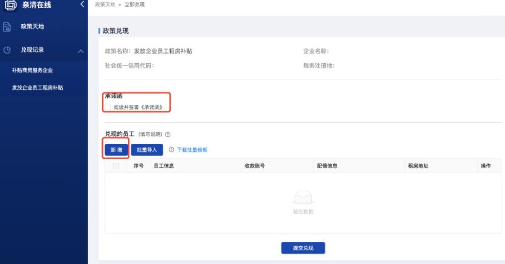 ---列表页面点击政策天地根据相关需求进行兑现(选择序列2:发放企业员工租房补贴),如下图所示: